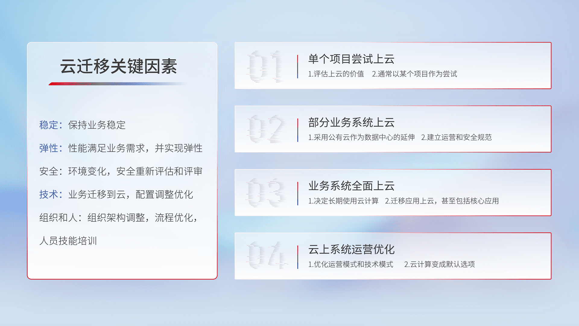 结合实际业务,,,,从规划设计、、、云平台选型、、、、云原生改造、、、数据迁移、、、集成交付,,,迁移全过程为客户识别最佳上云路径,,,做好风险识别管理,,设计网络架构、、、、身份权限、、、、安全审计合规、、、、操作审计、、、、日志审计、、、监控告警策略、、多站点容灾设计等,,,对云上基础设施进行整体规划,,,提升IT治理水平,,,以满足弹性、、、高可用、、高性能的需求。。。