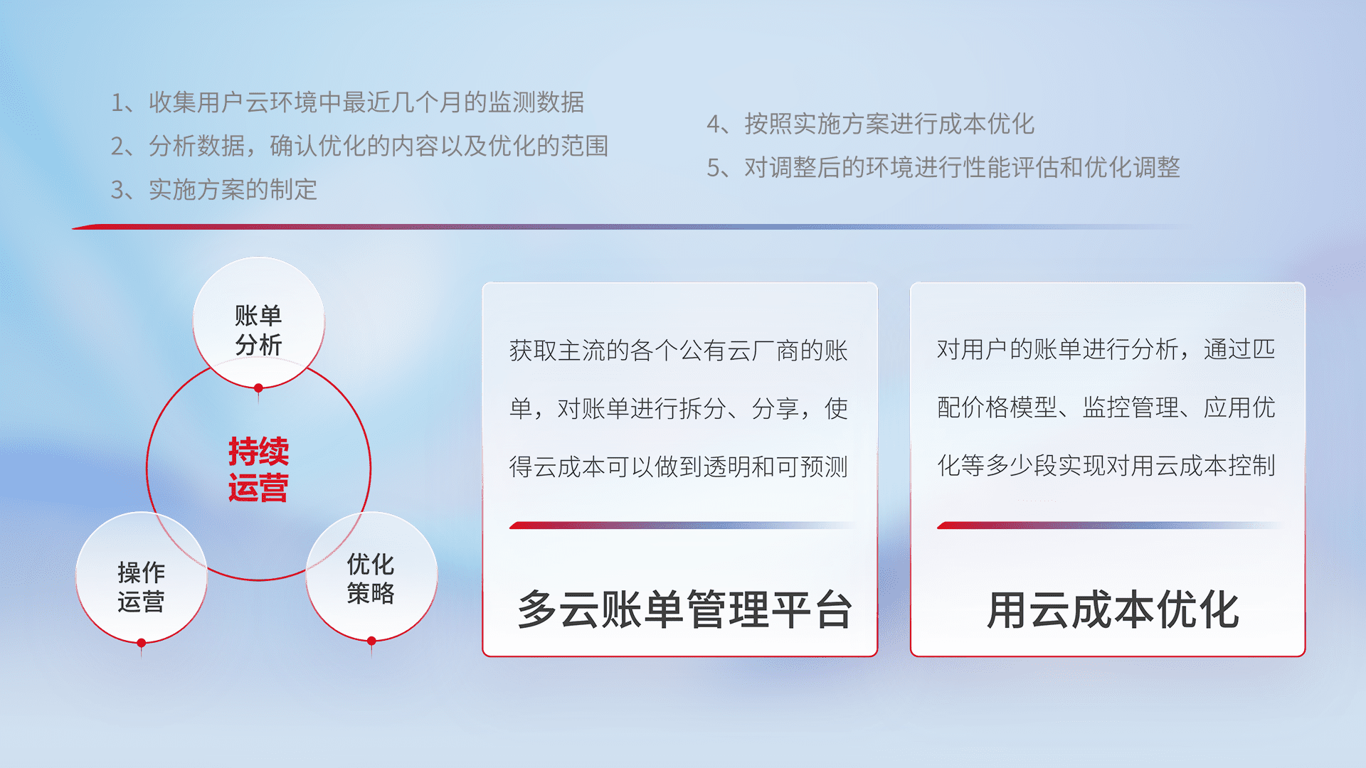 通过多云纳管,,,以统一的资源数据模型把客户的云资源进行抽象和封装,,,,进而实现对多云资源的统一操作,,保障云资源管理的可靠性、、稳定性与可用性。。量身定制化运维内容,,配置、、开发运维、、、补丁管理、、、、备份、、监控、、认证和访问管理、、、审计和日常巡检等,,,保障在用云过程中的可靠度,,稳定度以及高可用率。。
